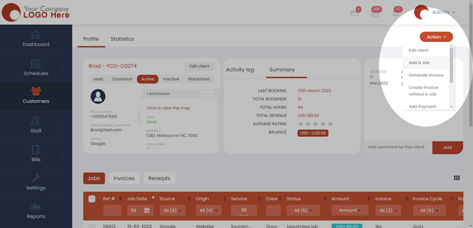 - Once you click on the selected customer, a new tab will open with the profile of that customer. Now find the Action button and click on Add a Job.