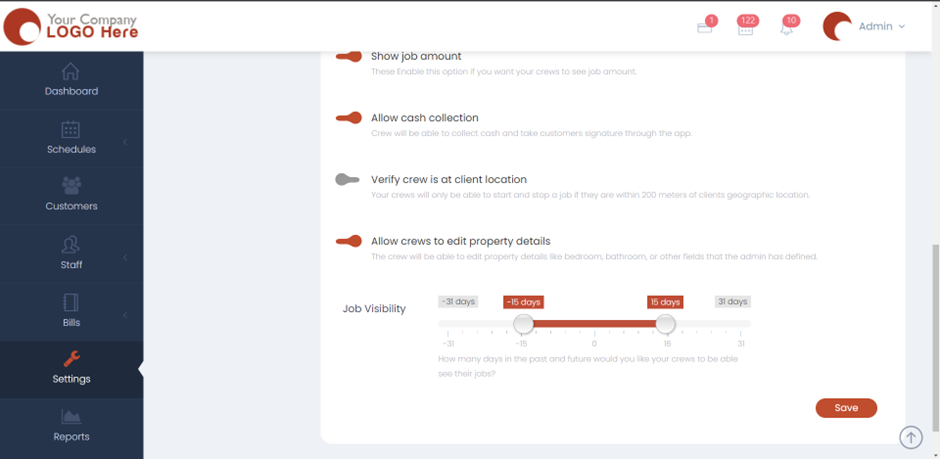 • Scroll down to the bottom and you will find the option to switch between whether or not to allow crews to edit the property details. This will allow the crews to edit property details like bedroom, bathroom, or other fields that the admin has defined.