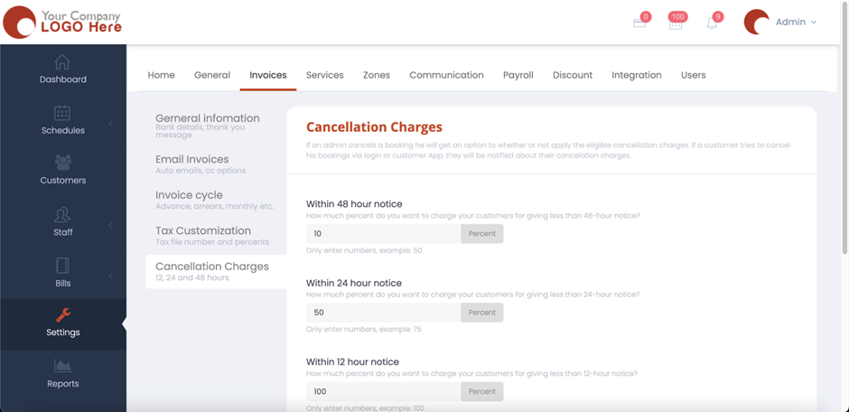 • You will be set the percentage of the booking amount that you’d want to be deducted once your customer cancels a booking. These could be within a 48, 28, or 12-hour notice according to how you’ve set them. You also have the option of “Completed Jobs” which is for the scenario where the system has completed the job but the job was cancelled.