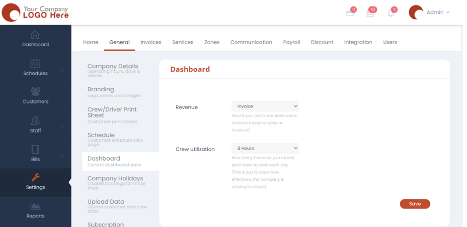 - Under “Crew utilization”, select from the dropdown the numbers of hours that you would like your crews to work each day. This is only for the reference of admins to analyse how effectively the company is utilizing the time of their crews.