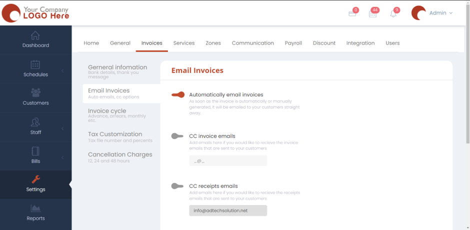 - Turn on or off Automatically email invoice depending on whether you want the customers to receive an invoice once it’s generated (either manually or automatically). CC invoice emails if you want to add emails here if you would like to receive the invoice emails that are sent to your customers. CC receipts emails if you want to Add emails here if you would like to receive the invoice emails that are sent to your customers.