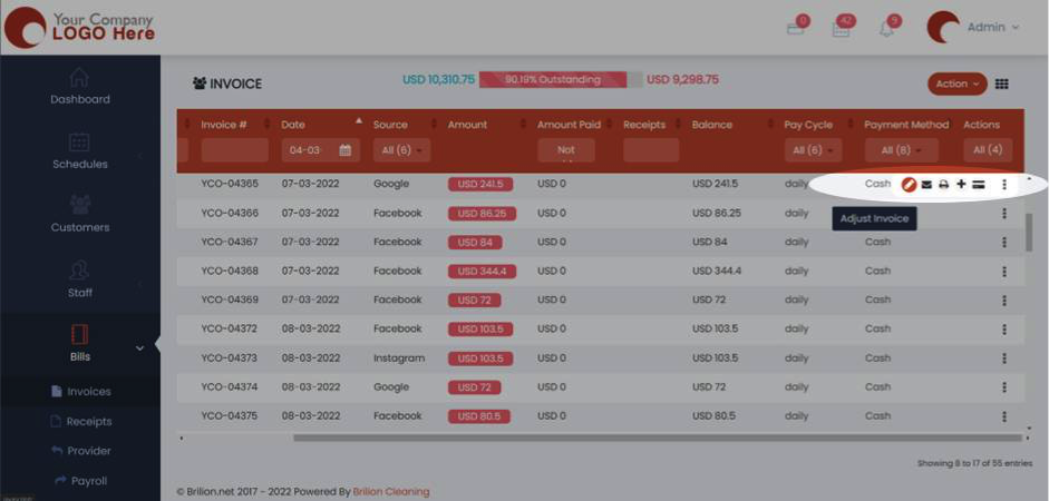 • To adjust an invoice, you will need to hover your mouse over to the Action button, which is also those three vertical dots at the end of every invoice row.