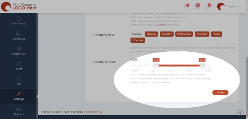 - Use the slider to highlight operating hours. You won’t be able to remove hours if you have pending bookings on those hours. Remove those bookings and then adjust the slider accordingly.