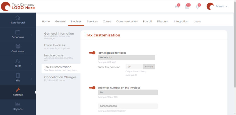 • Turn on show tax number on invoices if you want the tax number to be shown on the invoices for your customers. Fill in the tax type and the number in the given text boxes.